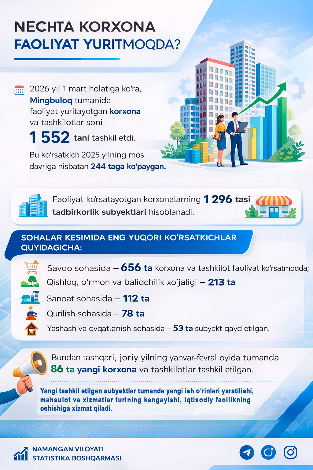 #Infografika Namangan viloyatida yangi tashkil etilgan korxonalar