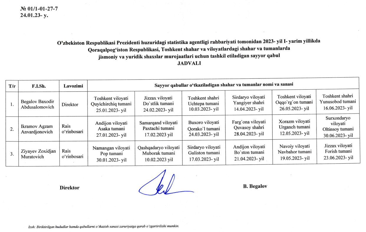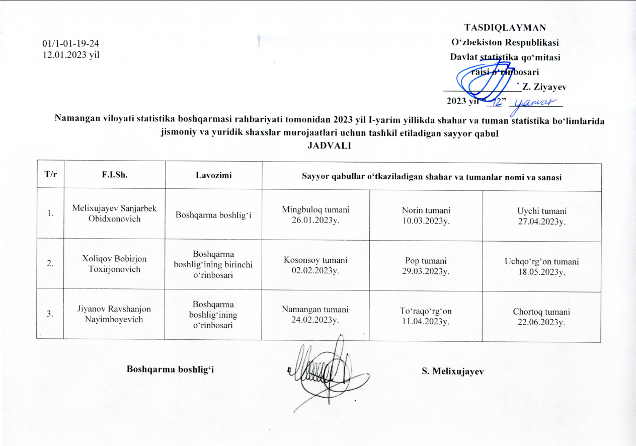 Viloyat statistika boshqarmasi rahbariyatini jismoniy shaxslarni va yuridik shaxslarning vakillarini qabul qilish jadvali