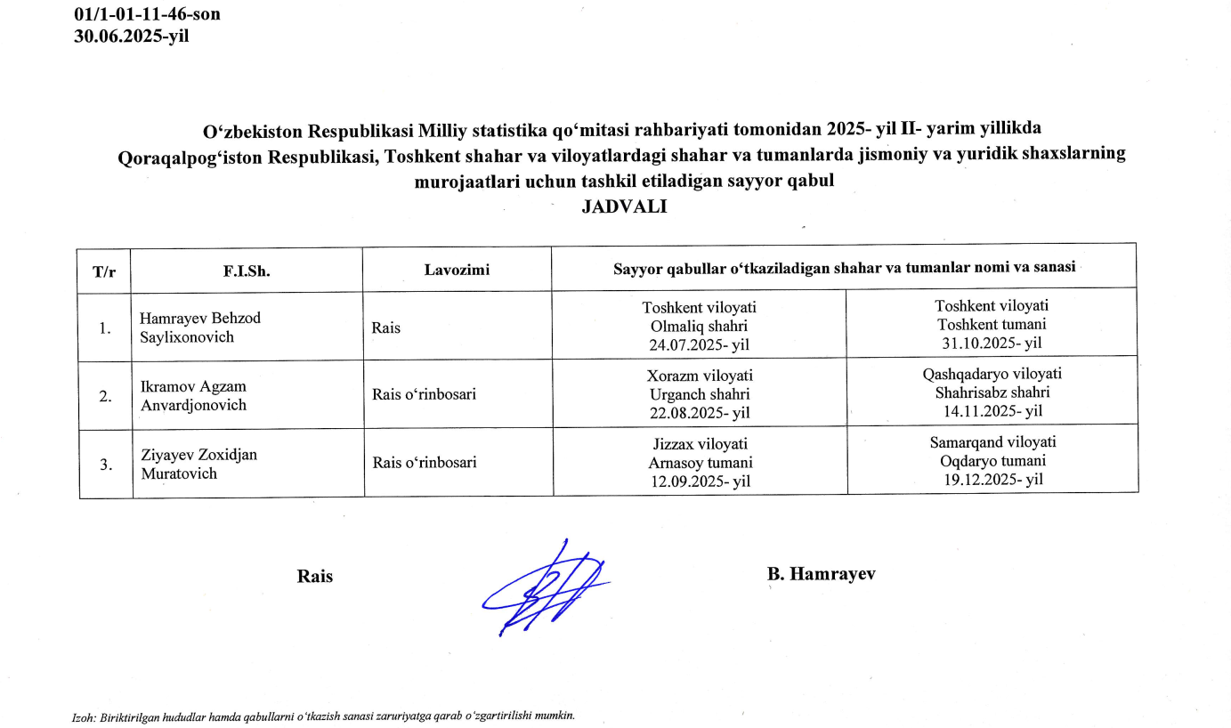 O’zbekiston Respublikasi Milliy statistika qo‘mitasi rahbariyati tomonidan 2025- yil II- yarim yillikda Qoraqalpog‘iston Respublikasi, Toshkent shahar va viloyatlardagi shahar va tumanlarda