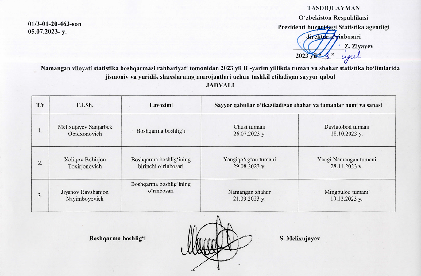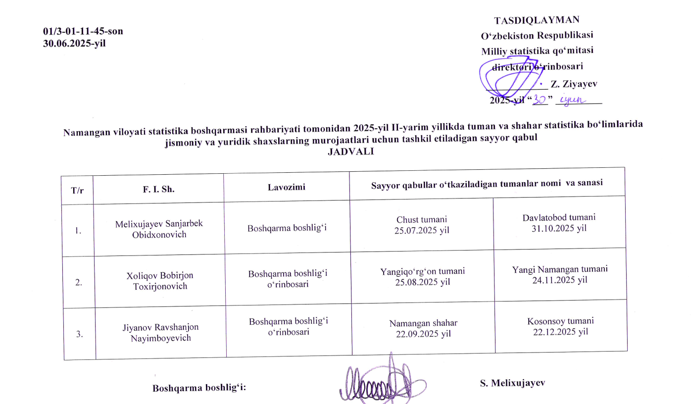 Namangan viloyati statistika boshqarmasi rahbariyati tomonidan 2025- yil II-yarim yillikda