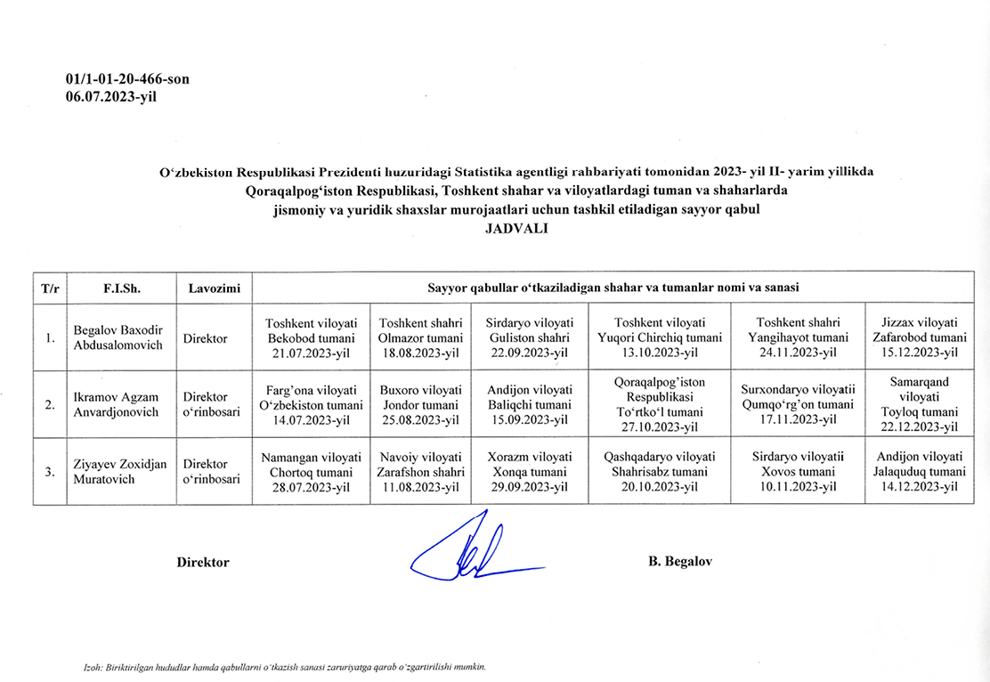 shahar va tuman statistika bo'limlarida jismoniy va yuridik shaxslar murojaatlari uchun tashkil etiladigan sayyor qabul
