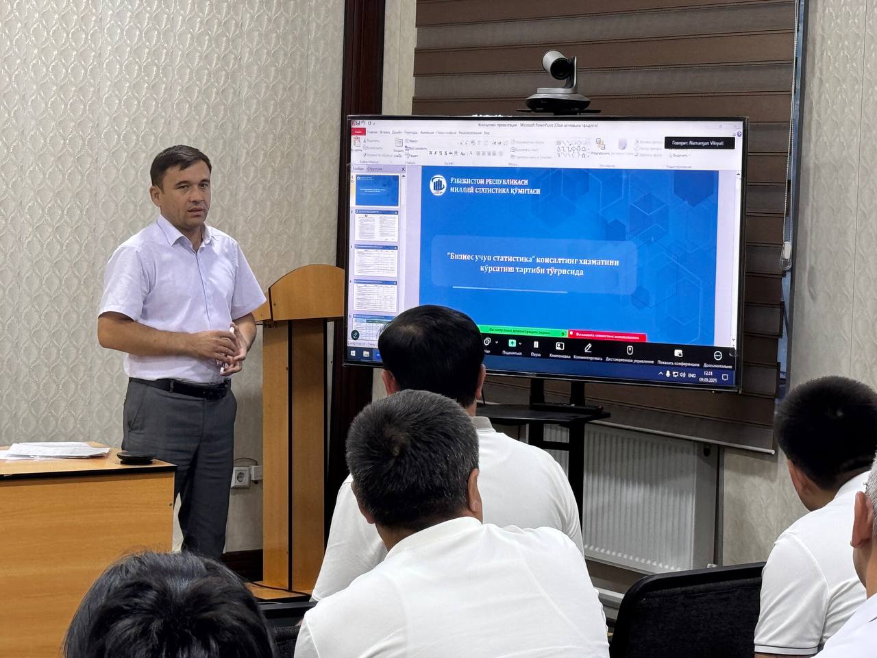 Seminarda O‘zbekiston Respublikasi Prezidentining 2025-yil 24-fevraldagi PQ-75-sonli qaroriga muvofiq, tadbirkorlik subyektlariga “Biznes uchun statistika” konsalting xizmatini joriy etish va uni amaliyotga tatbiq etish masalalari muhokama qilindi. Ishtirokchilarga mazkur xizmatning konsepsiyasi, ko‘rsatish tartibi, xizmatlar doirasi, shuningdek, statistika hisobotlari va ma’lumotlar bilan ishlashda tadbirkorlik subyektlariga qanday axborot-tahliliy va maslahat yordami ko‘rsatilishi batafsil tushuntirildi.