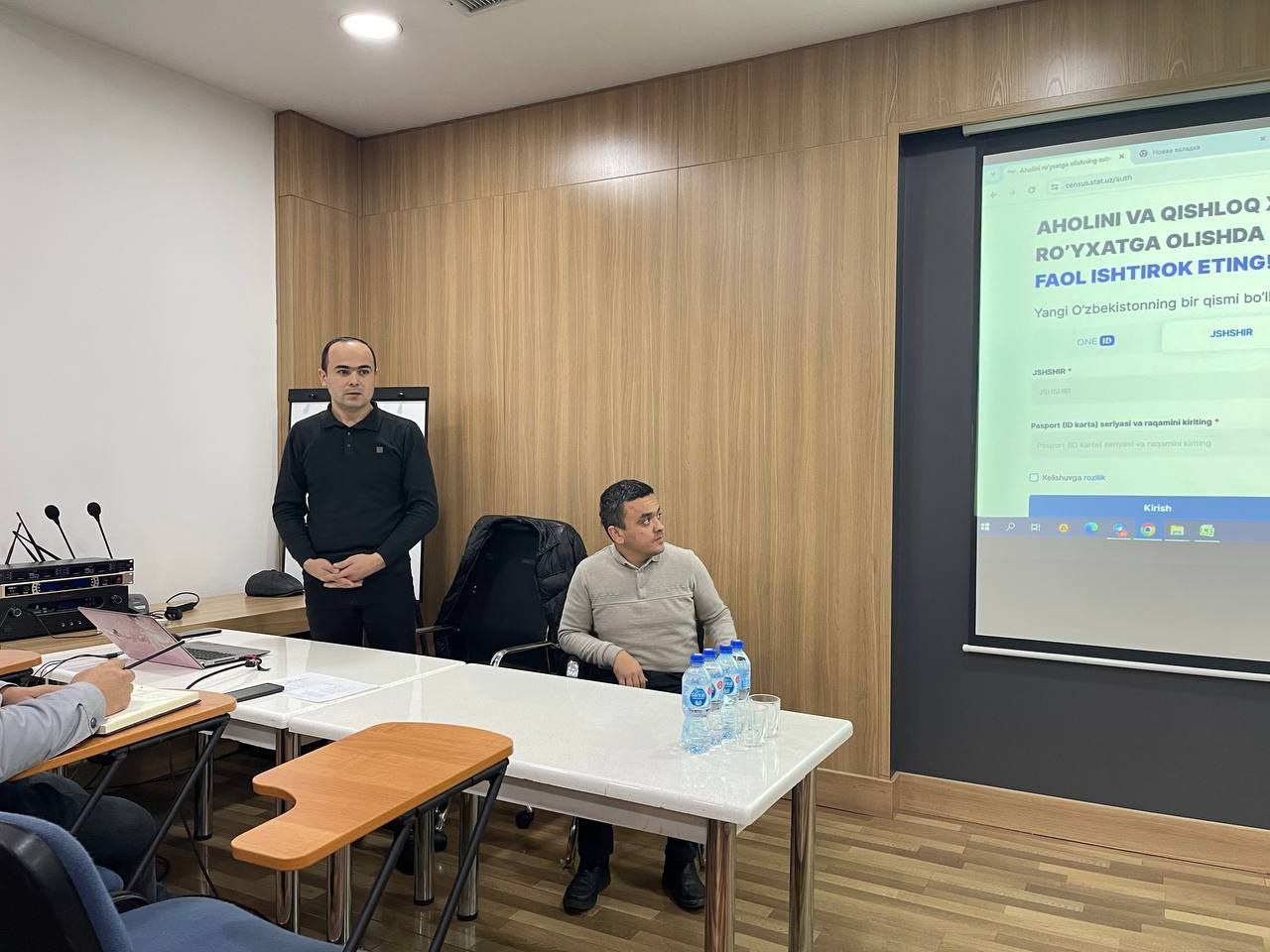 Namangan viloyati Uchqo‘rg‘on tumani statistika bo‘limi mutaxassislari tomonidan Uztex Uchkurgan qo‘shma korxonasi xodimlariga aholi va qishloq xo‘jaligini ro‘yxatga olish jarayonida onlayn ro‘yxatdan o‘tish bo‘yicha amaliy seminar tashkil etildi.