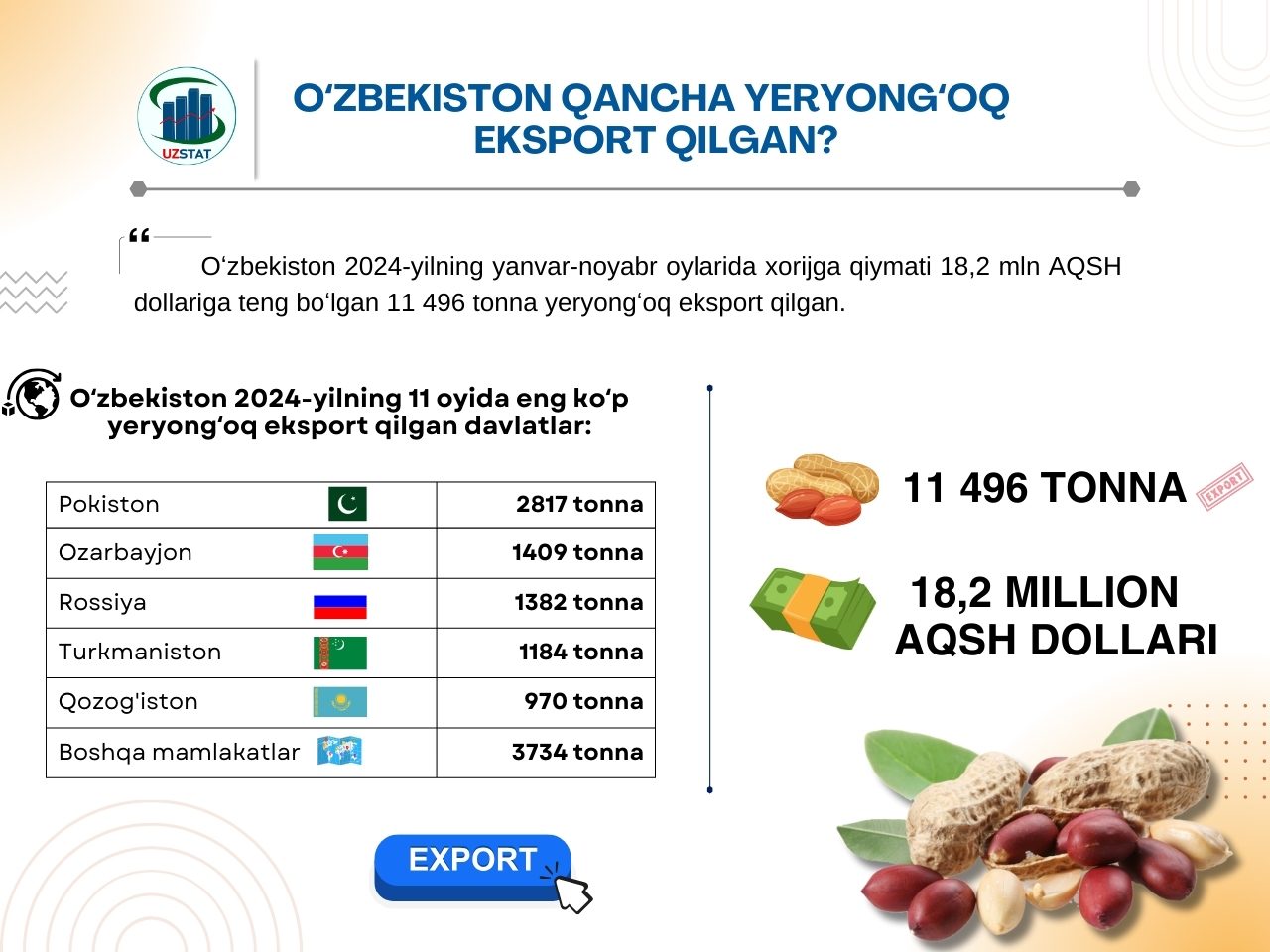 2024- yilning yanvar-noyabr oylarida Namangan viloyati 6 ta xorijiy davlatdan qiymati 8,1 mln AQSH dollariga teng bo‘lgan jami 6,9 ming tonna choy mahsulotlari importini amalga oshirgan.
