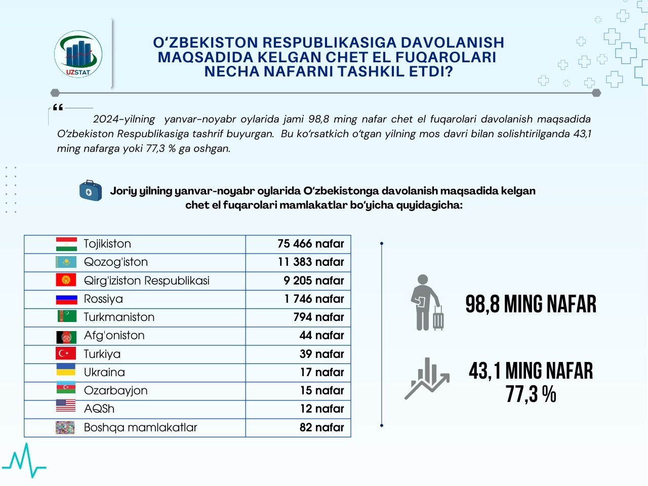 2024- yilning 1- dekabr holatiga ko‘ra, sog‘liqni saqlash va ijtimoiy xizmatlar ko‘rsatish sohasida jami faoliyat ko‘rsatayotgan korxona va tashkilotlar soni 738 tani tashkil etib, 2024- yilning yanvar-noyabr oylarida bu sohada 99 ta yangi korxona va tashkilotlar tashkil etildi.