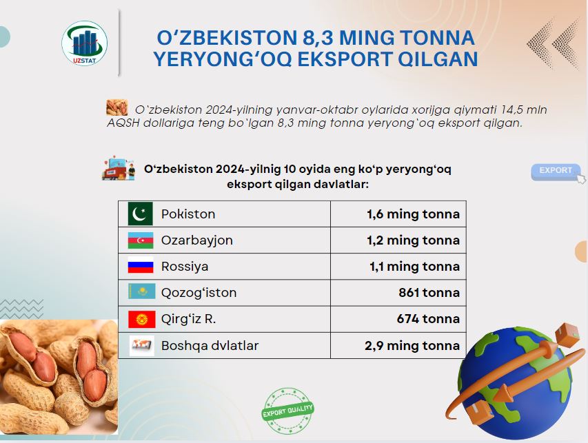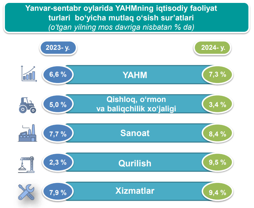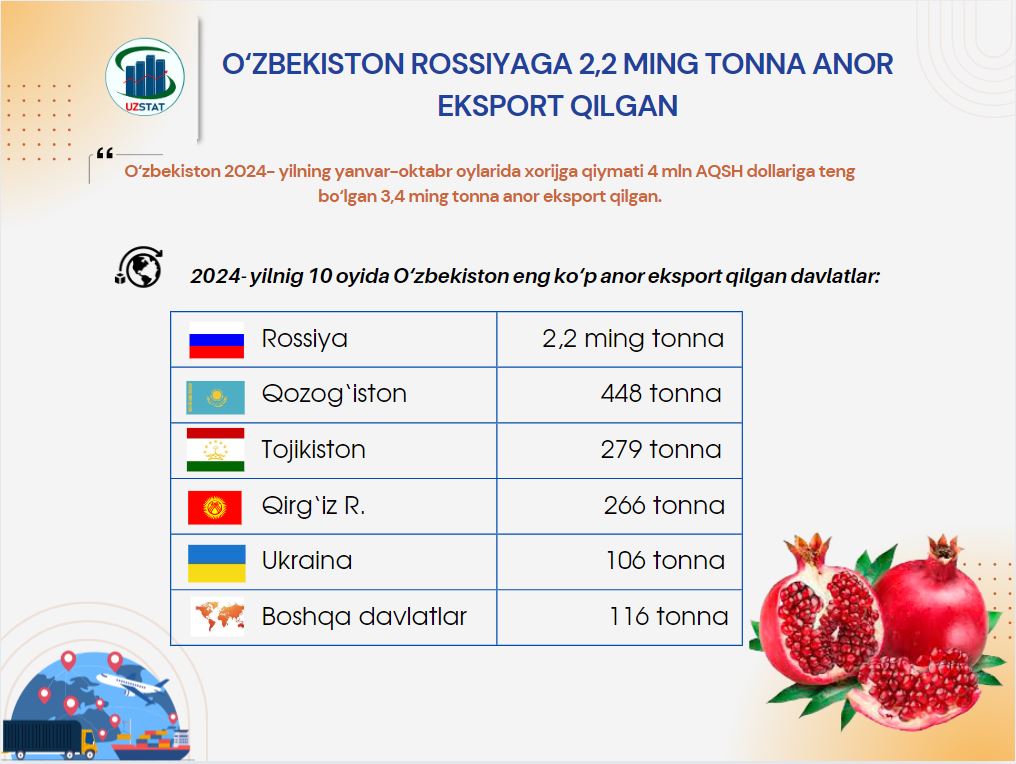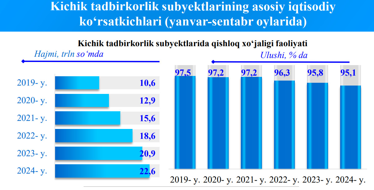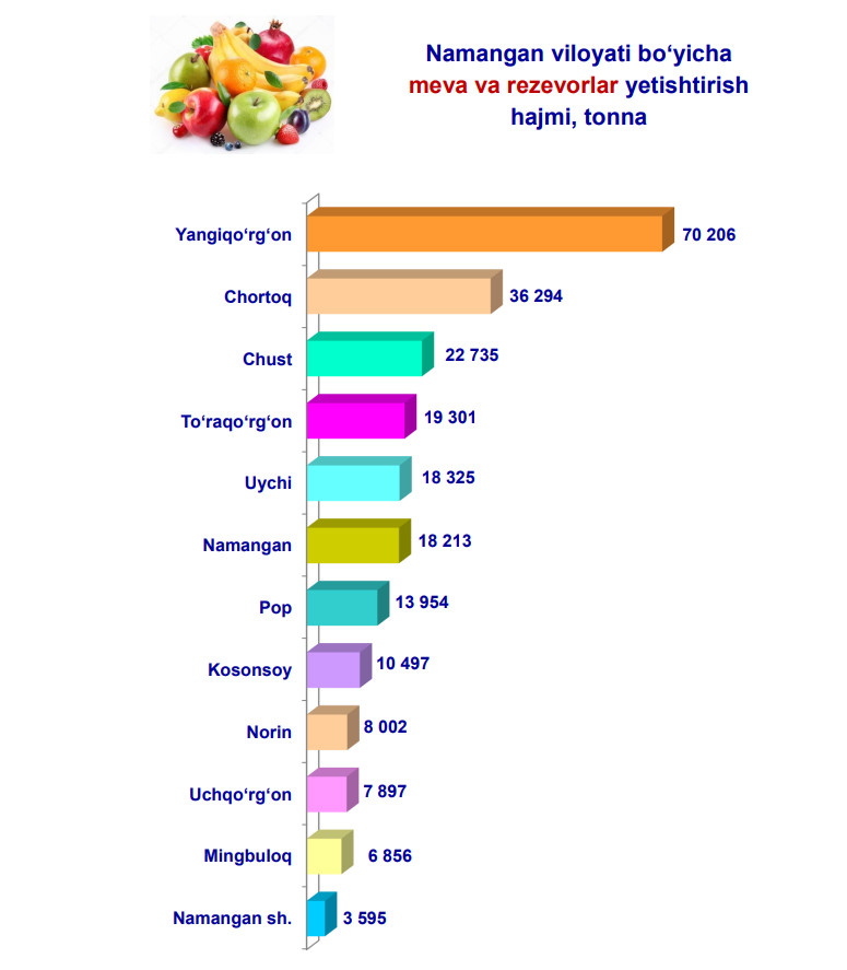 2024- yilning yanvar-sentabr oylarida barcha toifadagi xo‘jaliklar tomonidan 235,9 ming tonna meva va rezevorlar yetishtirilgan bo‘lib, 2023- yilning mos davriga nisbatan 7,6 % ga ko‘paygan.