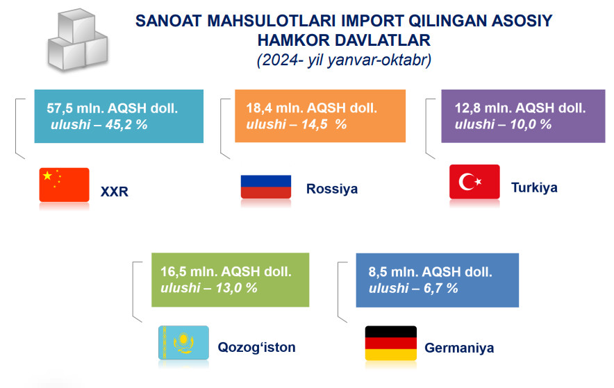 2024- yilning yanvar-oktabr oylarida viloyatimiz importi tarkibida sanoat mahsulotlarining ulushi 21,6 % ga yetdi.