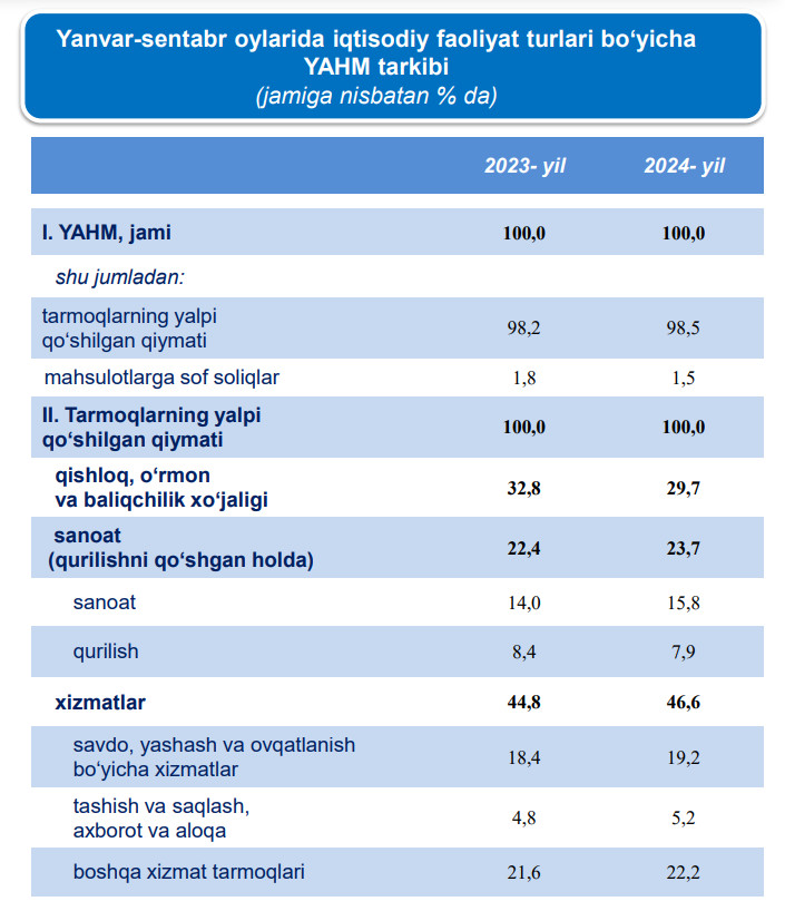 2024- yilning yanvar-oktabr oylarida Namangan viloyatida ko‘rsatilgan xizmatlar hajmi 34,4 trln so‘mni tashkil etib, 2023- yilning mos davriga nisbatan 6,9 trln so‘mga ko‘paygan.