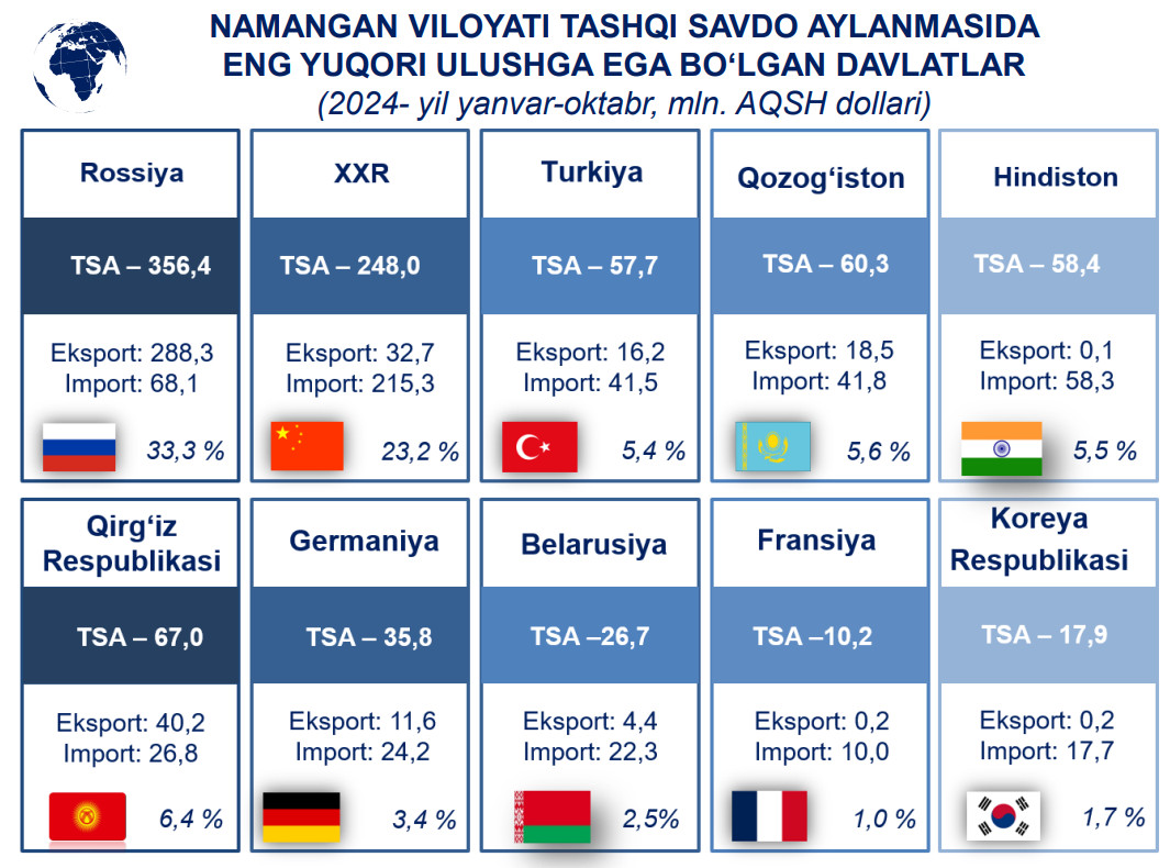 2024- yilning yanvar-oktabr oylarida Namangan viloyatida 7,3 trln so‘mlik savdo xizmatlari ko‘rsatilgan bo‘lib, 2023- yilning mos davriga nisbatan 15,3 % ga ko‘paygan.
