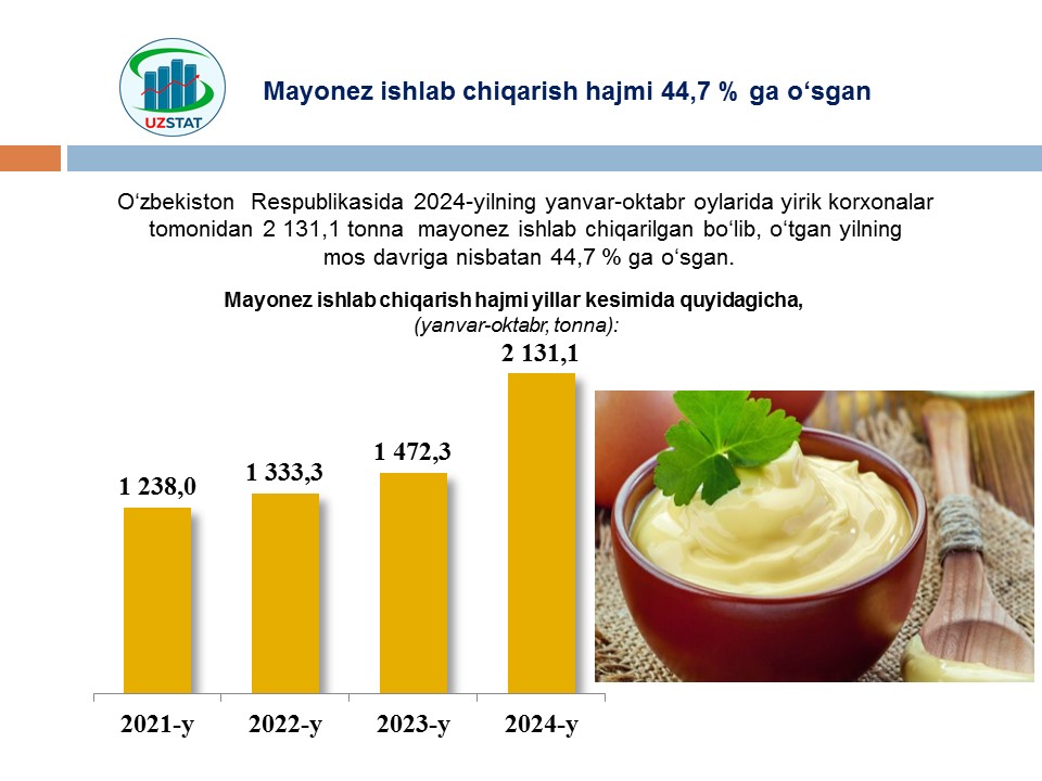 Joriy yilning yanvar-oktabr oylarida Namangan viloyatida yirik korxonalar tomonidan jami 8 ming tonna tozalangan o‘simlik yog‘i ishlab chiqarilgan bo‘lib, 2023- yilning mos davriga nisbatan 1,5 ming tonnaga ko‘paygan.