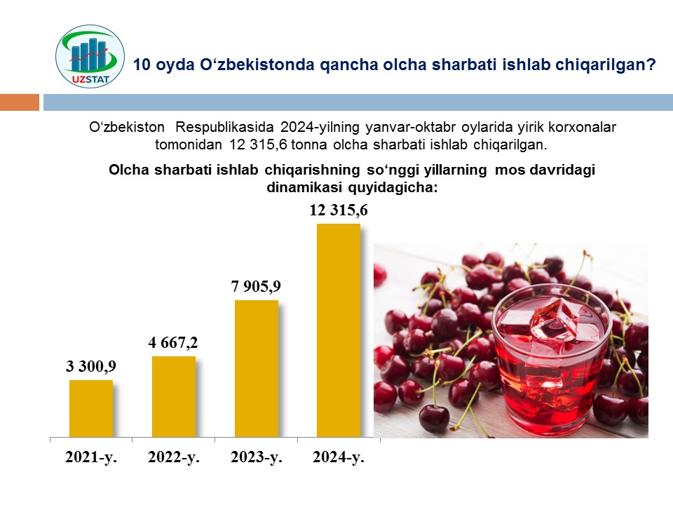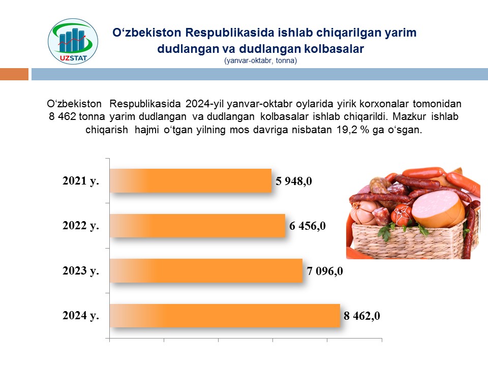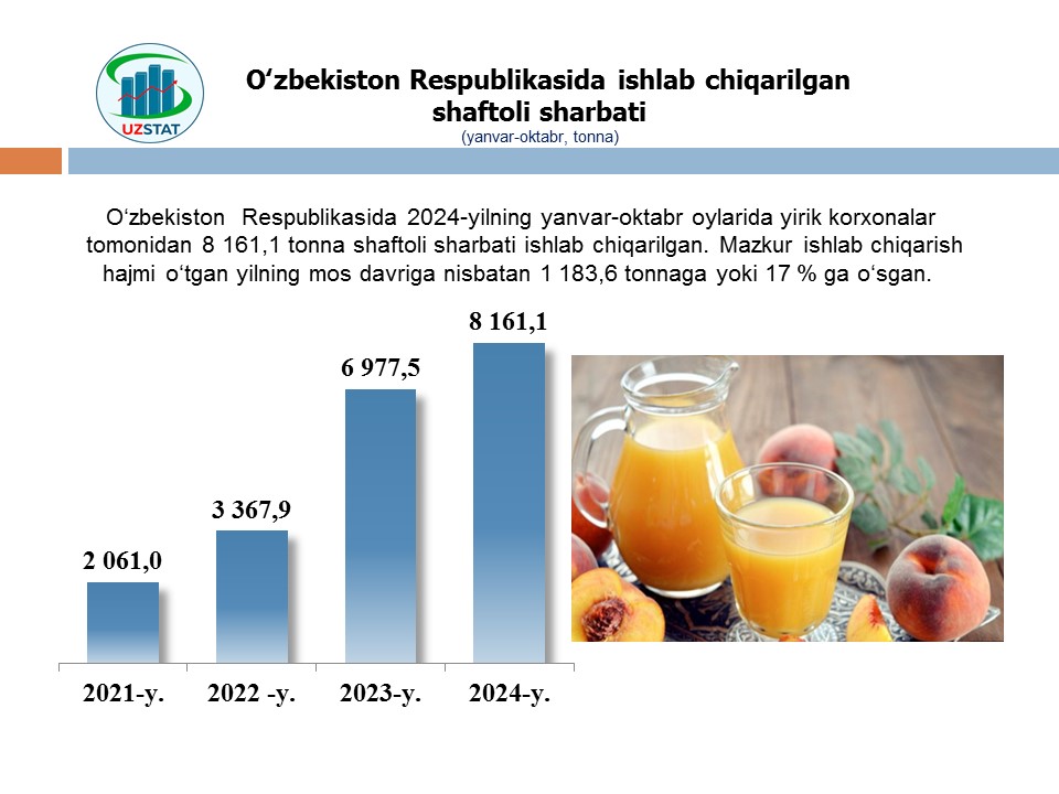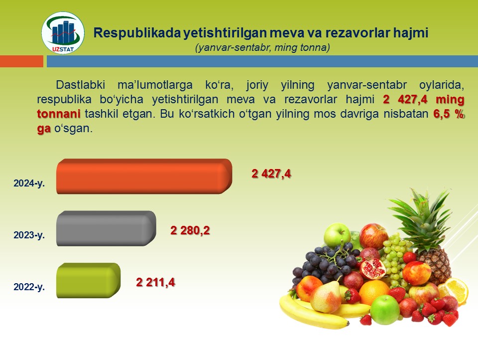 2024- yilning yanvar-oktabr oylarida Namangan viloyati xorijiy davlatlarga qiymati 72,9 mln AQSH dollarilik oziq-ovqat mahsulotlari eksportini amalga oshirgan bo‘lib, bu ko‘rsatkich 2023- yilning mos davriga nisbatan 29 % ga ko‘paygan.