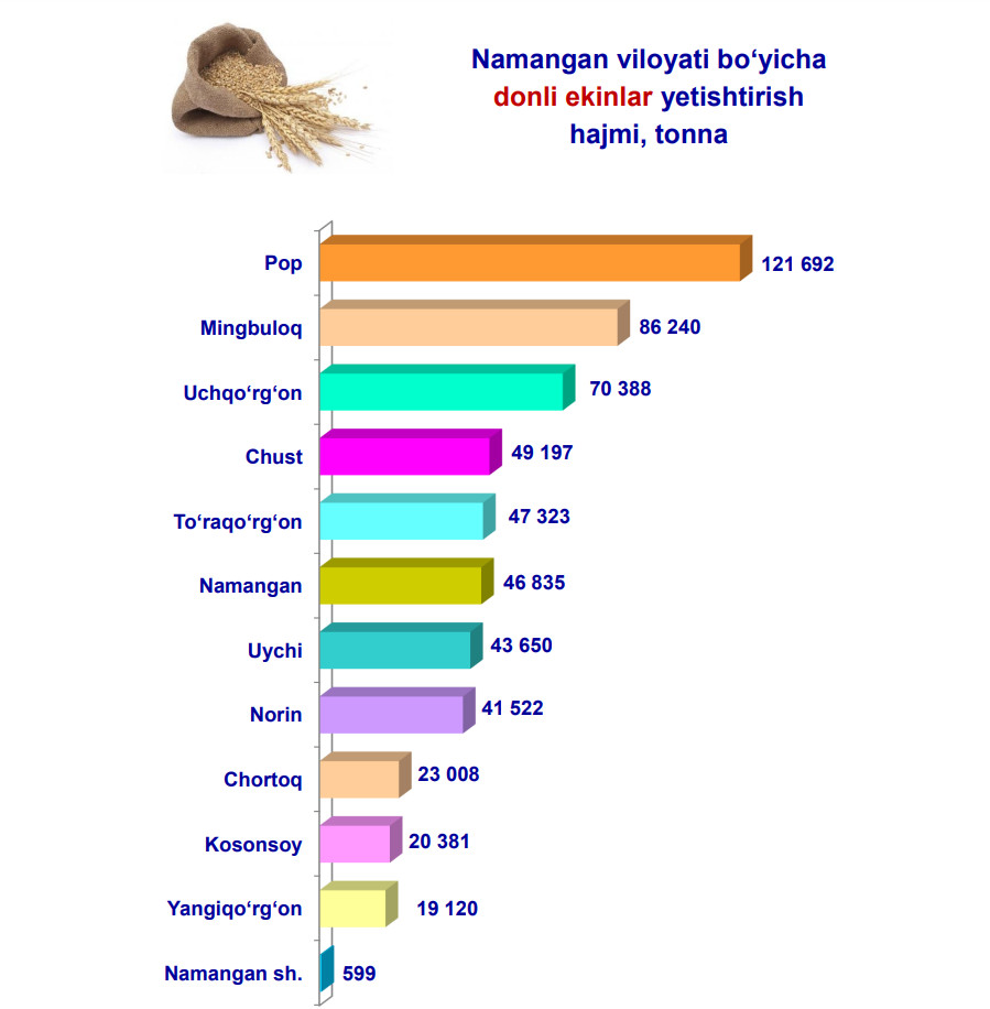 2024- yilning yanvar-sentabr oylarida Namangan viloyatida barcha toifadagi xo‘jaliklar tomonidan 569 ming 955 tonna donli ekinlar ishlab chiqarildi. Bu 2023- yilning yanvar-sentabr oylariga nisbatan 10,4 % ga ko‘paygan.