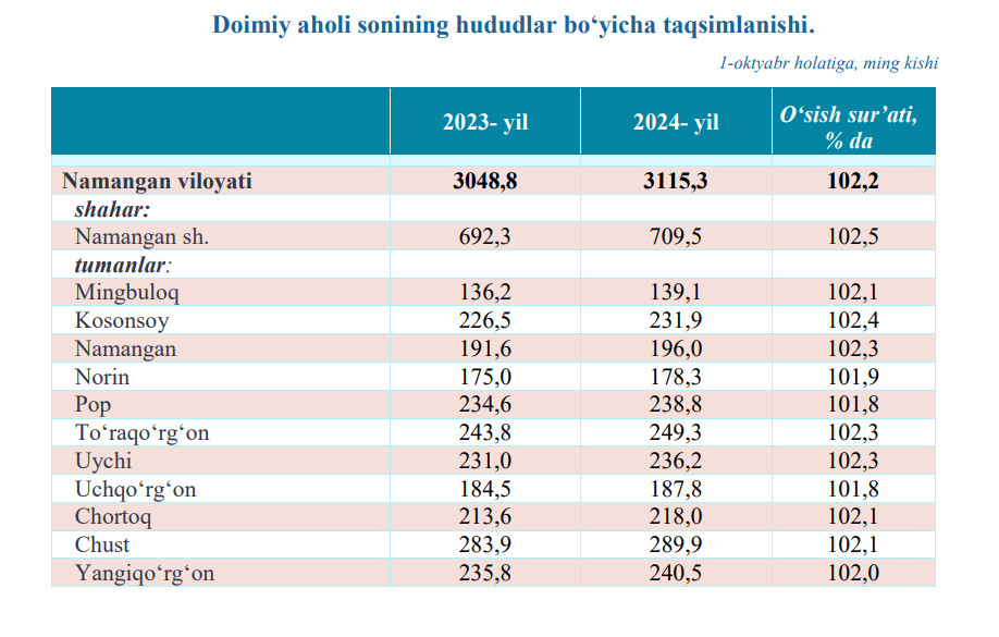 Namangan viloyatida 2024- yil 1-oktabr holatiga doimiy aholi soni 3115,3 ming kishini tashkil etib, yil boshiga nisbatan 49,2 ming kishiga yoki 1,6 % ga ko‘paydi.