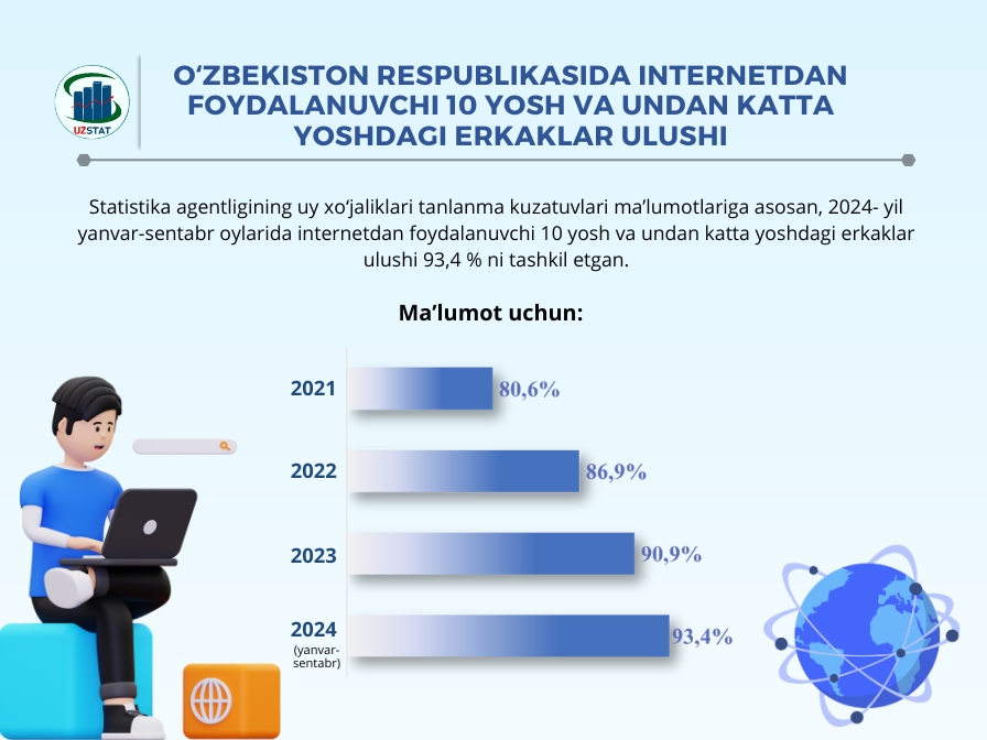 2024- yil yanvar-sentabr oylarida internetdan foydalanuvchi 10 yosh va undan katta yoshdagi erkaklar ulushi 93,4 % ni tashkil etgan.
