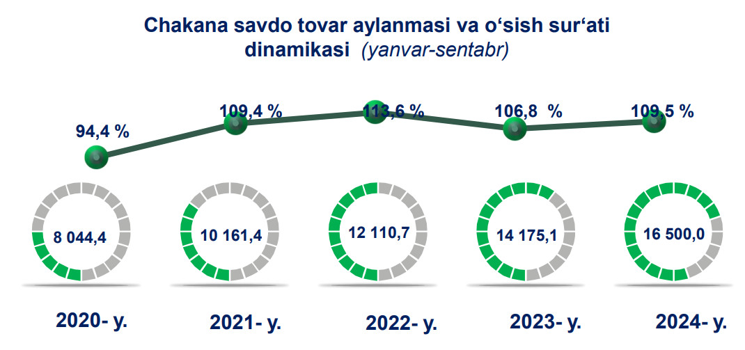 2024- yilning yanvar-sentabr oylarida Namangan viloyati bo‘yicha chakana savdo tovar aylanmasi 16,5 trln so‘mni tashkil etib, 2023- yilning mos davriga nisbatan 9,5 % ga ko‘paygan.