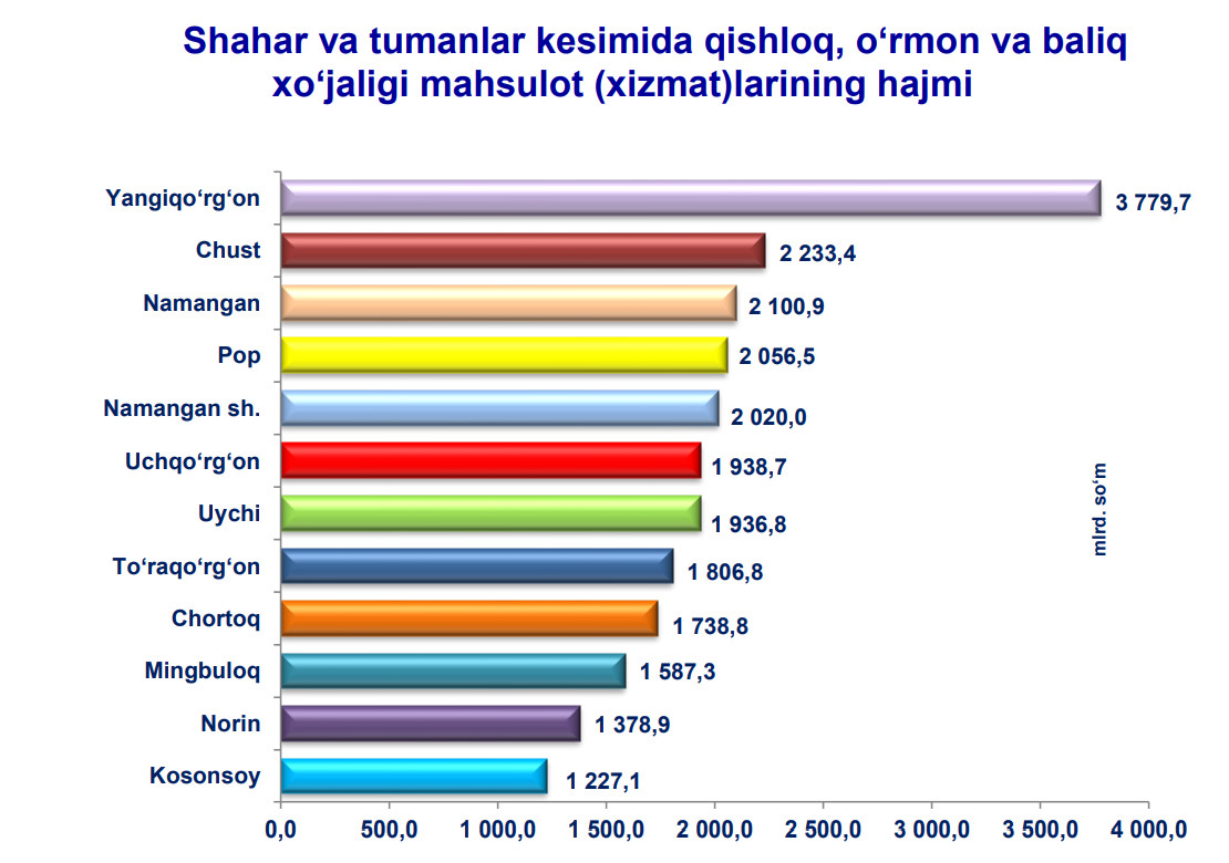 2024- yilning yanvar- sentabr oylarida, shahar va tumanlar kesimida qishloq, o‘rmon va baliq xo‘jaligi mahsulot (xizmat)larining eng yuqori hajmi Yangiqo‘rg‘on tumani 3 799,7 mlrd so‘m va Chust tumani 2233,4 mlrd so‘m qayd etildi.