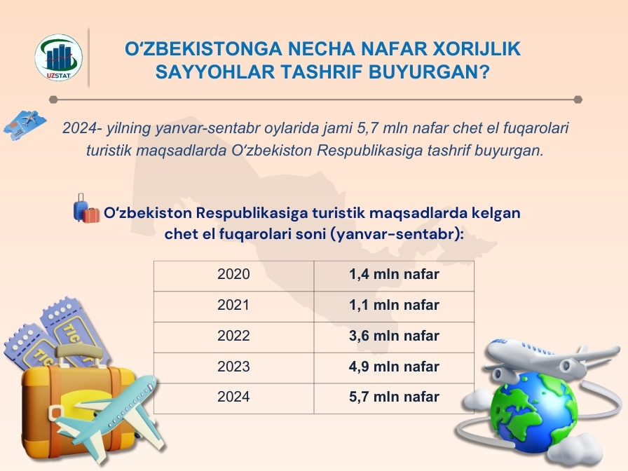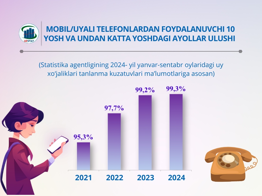 Statistika agentligining uy xo‘jaliklari tanlanma kuzatuvlari ma’lumotlariga asosan, 2024- yil yanvar–sentabr oylarida internetdan foydalanuvchi 10 yosh va undan katta yoshdagi aholi ulushi 92,7 % ni tashkil etdi.