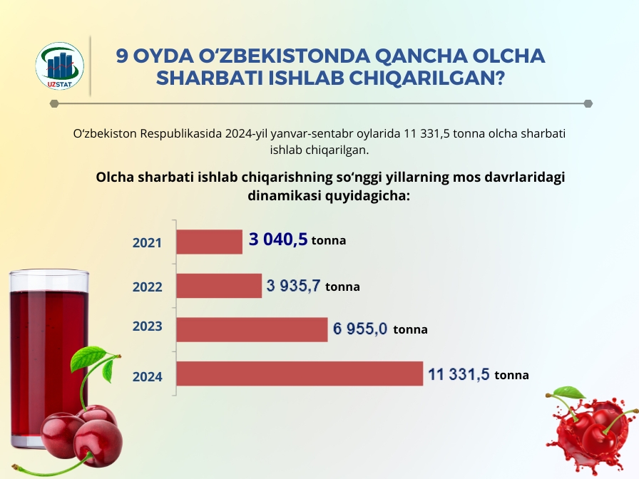 Oʻzbekiston Respublikasida 2024-yil yanvar-sentabr oylarida 11 331,5 tonna olcha sharbati ishlab chiqarilgan.