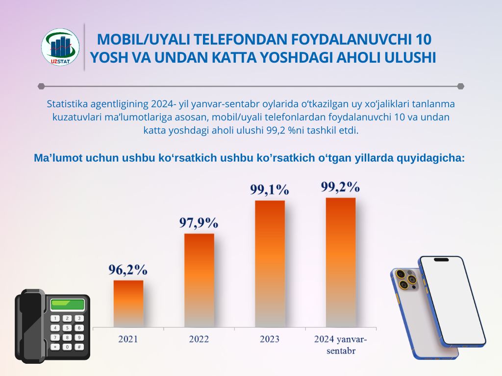 Uy xo‘jaliklari tanlanma kuzatuvlari ma’lumotlariga asosan, 2024- yil yanvar-sentabr oylarida mobil/uyali telefonlardan foydalanuvchi 10 va undan katta yoshdagi aholi ulushi 99,2 % ni tashkil etgan.