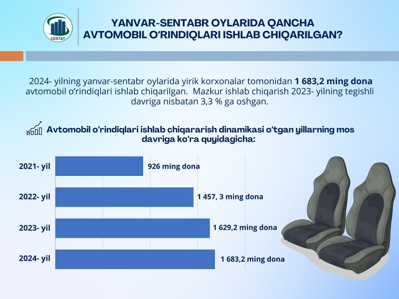 2024- yilning yanvar oyida yirik korxonalar tomonidan 1 683,2 ming dona avtomobil oʻrindiqlari ishlab chiqarilgan.