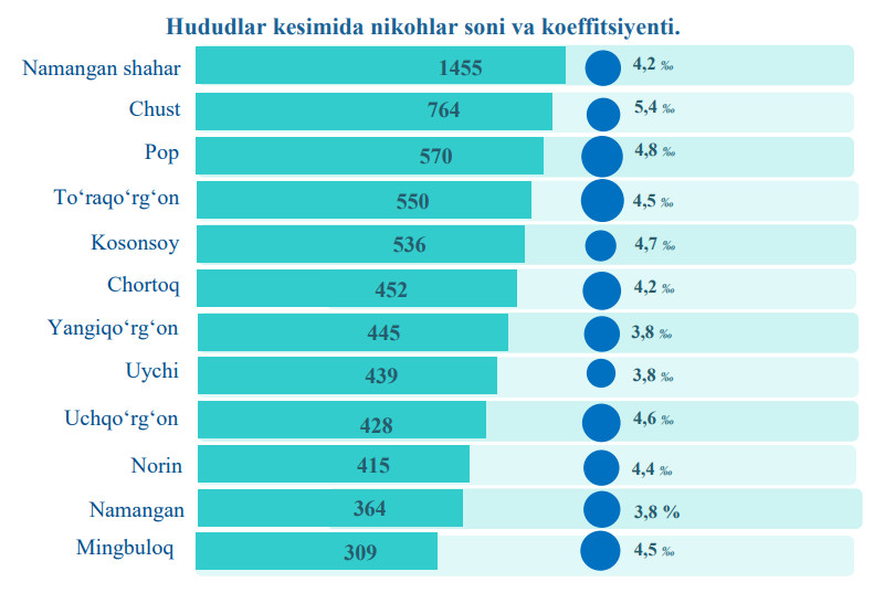 2024- yilning yanvar-iyun oylarida FHDYO organlari tomonidan Namangan viloyati bo‘yicha 6 727 ta nikoh holatlari qayd etilgan.
