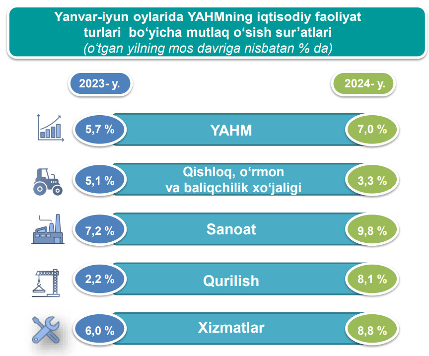 2024-yilning yanvar-iyun oylarida YAHMning o‘sishi hudud iqtisodiyotining asosiy tarmoqlaridagi ijobiy o‘sish sur’atlari bilan bog‘liqdir.