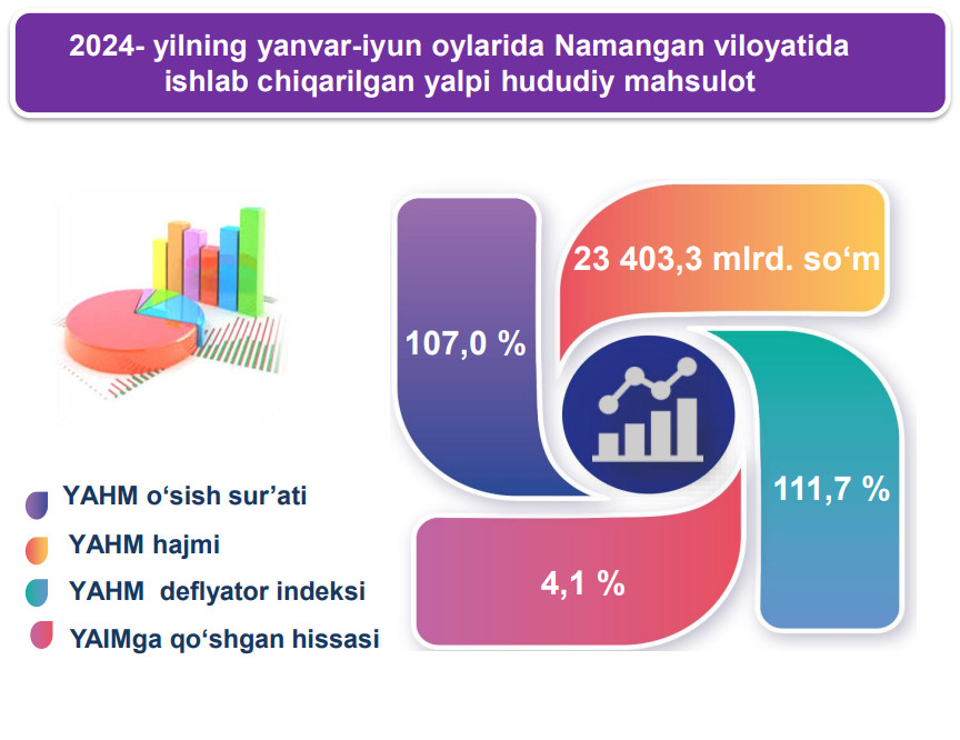 2024-yilning yanvar-iyun oylarida Namangan viloyati bo‘yicha yalpi hududiy mahsulot (keyingi o‘rinlarda – YAHM) hajmi joriy narxlarda 23 403,3 mlrd. so‘mni tashkil etdi va 2023-yilning yanvar-iyun oylari bilan taqqoslaganda 7,0 % ga o‘sdi.