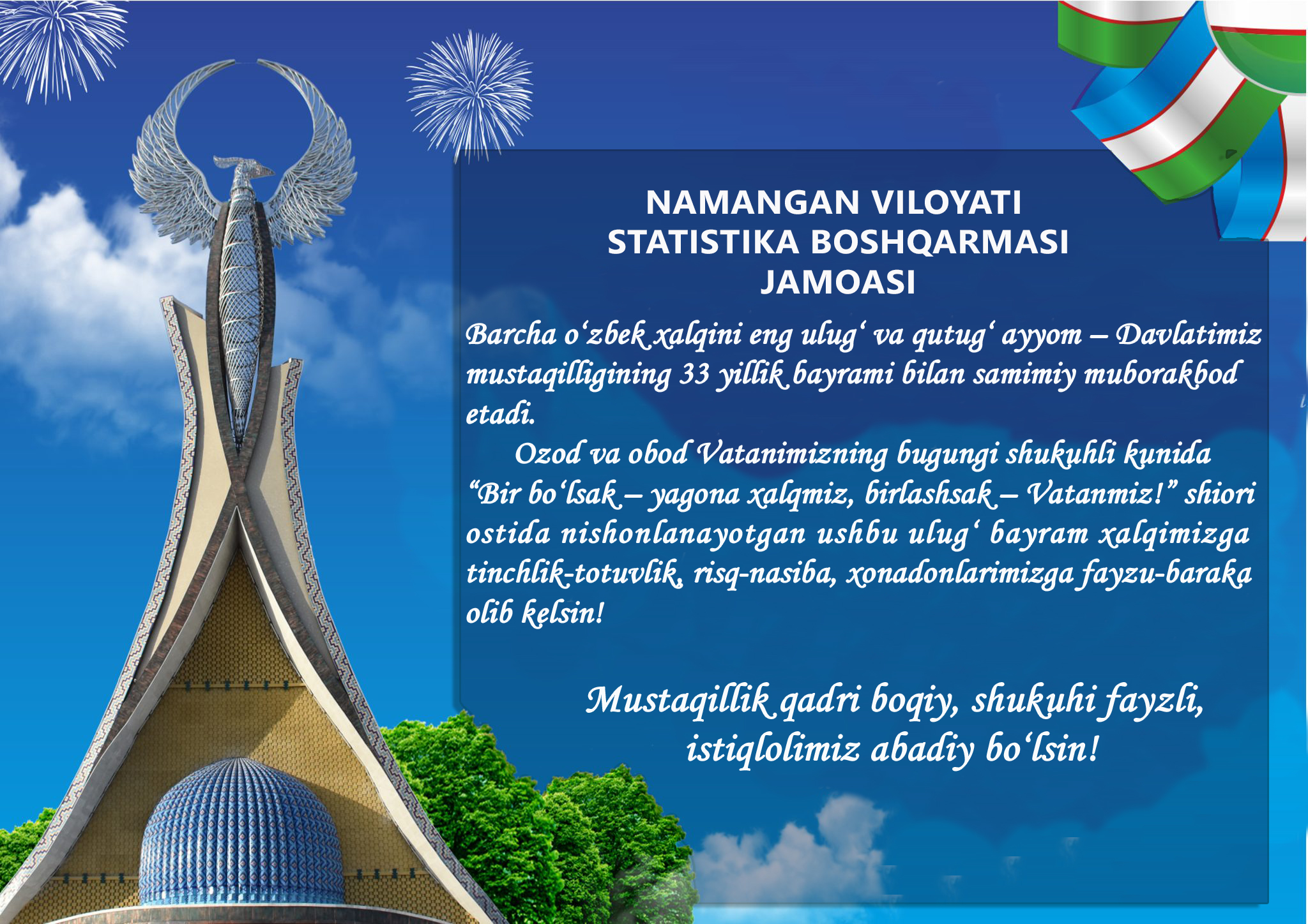 Aziz yurtdoshlar! Sizlarni O‘zbekiston Respublikasi Mustaqilligining 33 yilligi bilan samimiy muborakbod etamiz!