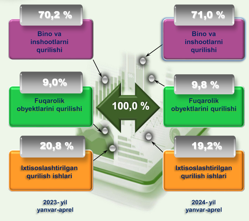 2024-yilning yanvar-aprel oylarida Norin tumanida jami 101,9 mlrd. so‘mlik qurilish ishlari bajarilib,