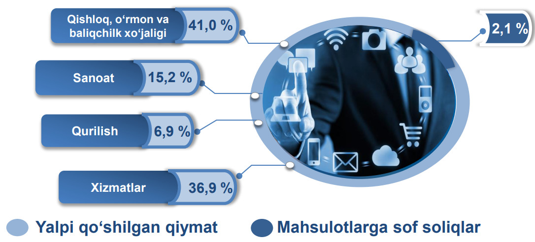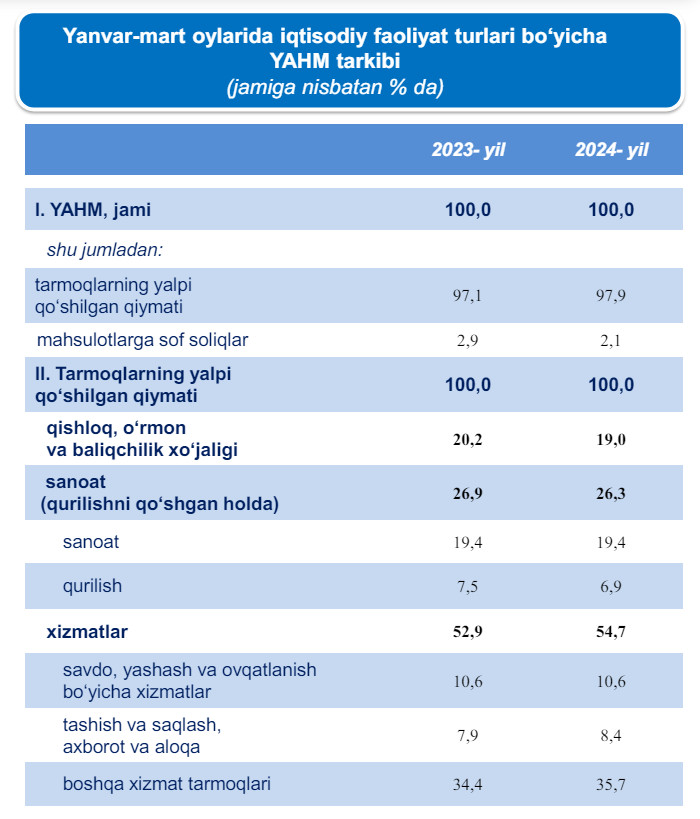 2024-yilning yanvar-mart oylarida hudud iqtisodiyotining barcha tarmoqlarida yaratilgan yalpi qo‘shilgan qiymat (YAQQ) hajmi umumiy YAHMning 97,9 % ini, mahsulotlarga sof soliqlar esa 2,1 % ini tashkil etdi.