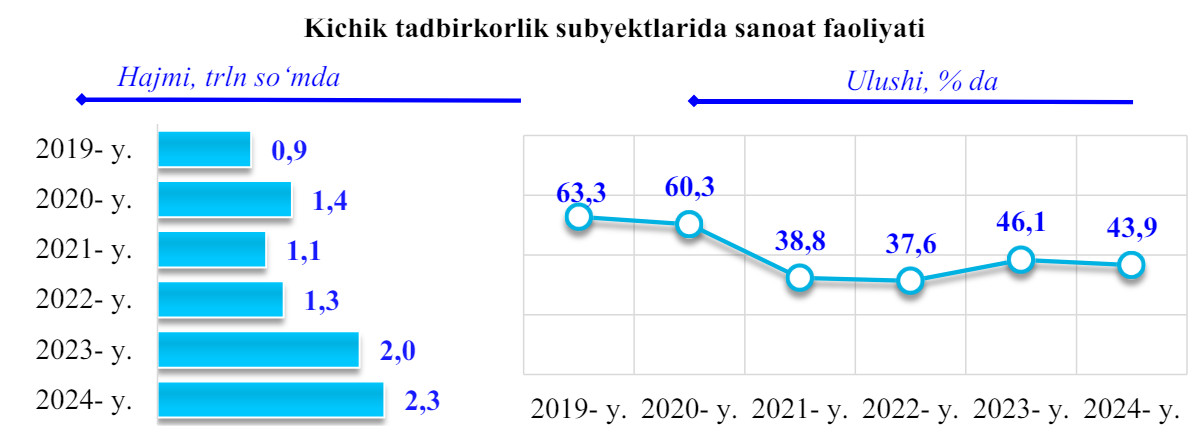 2024- yil yanvar-mart oylarida kichik tadbirkorlik subyektlari tomonidan 3 364,3 mlrd. so‘mlik xizmatlar ko‘rsatildi yoki ko‘rsatilgan xizmatlar umumiy hajmining 67,0 % ini tashkil qildi va o‘sish sur‘ati 2023- yil yanvar - mart oylariga nisbatan 117,1 % ni tashkil qildi.