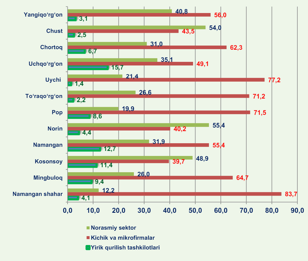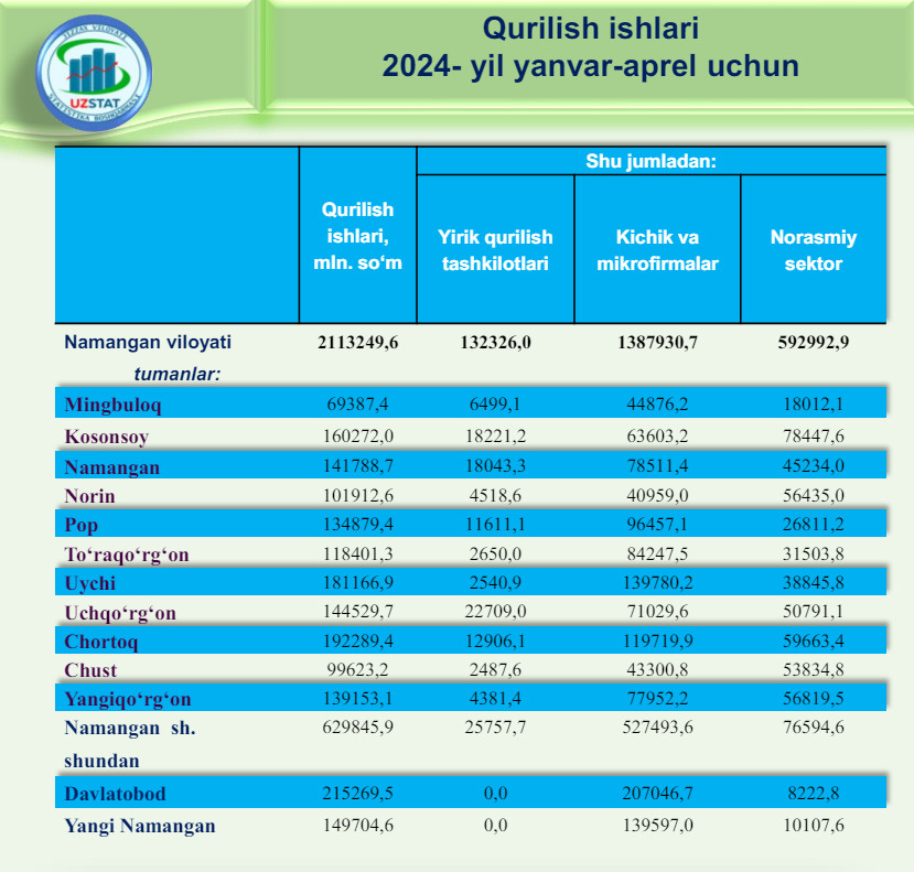 2024- yilning yanvar-mart oylari yakunlariga ko‘ra, Namangan viloyati bo‘yicha qurilishda yaratilgan yalpi qo‘shilgan qiymat hajmi 627,7 mlrd. so‘mni tashkil etdi va o‘tgan yilning mos davri bilan taqqoslaganda 9,8 % ga o‘sdi.