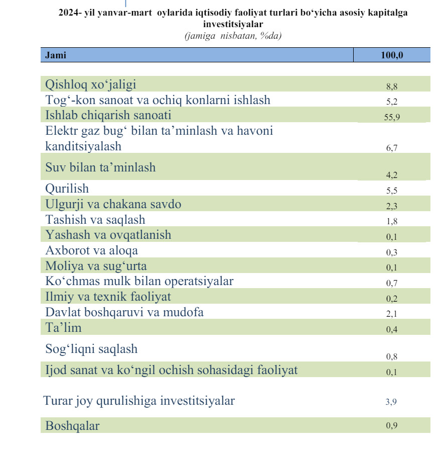 2024- yil yanvar-mart oylarida asosiy kapitalga o‘zlashtirilgan investitsiyalar 9203,3 mlrd. so‘mni tashkil qilib, bu o‘tgan yilning mos davriga nisbatan 273,9 %ni tashkil etdi.