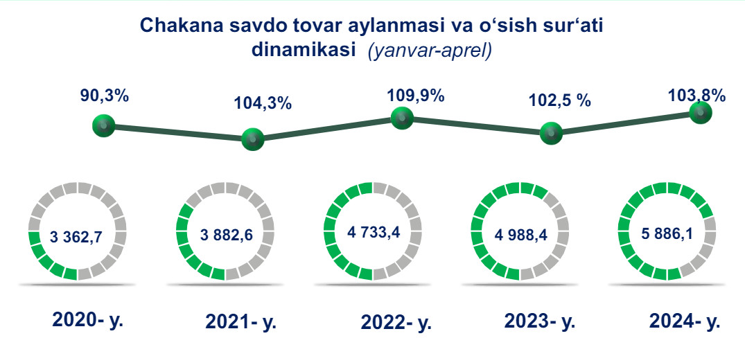 Yanvar-aprel oylarida Namangan viloyatining chakana savdo tovar aylanmasi va o‘sish sur‘ati dinamikasi.