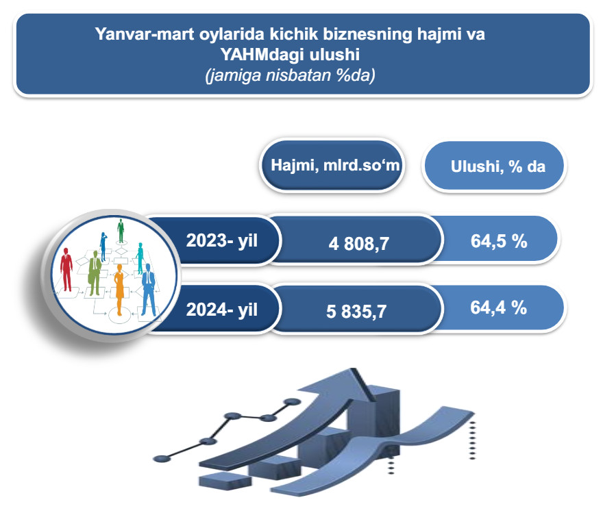 2024- yilning yanvar-mart oylarida Namangan viloyatida kichik tadbirkorlik subyektlarining yalpi hududiy mahsulot hajmidagi ulushi 64,4 % ni yoki 5 835,7 mlrd. so‘mni tashkil etdi.