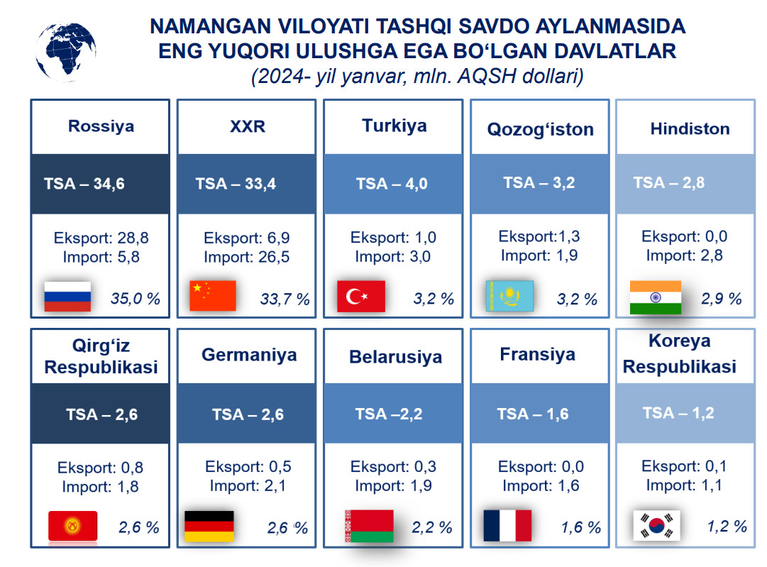Joriy yilning yanvar oyida viloyatimizdan 45,5 mln. AQSH dollari qiymatidagi tovar va xizmatlar eksport qilinishi taʼminlandi. Bu ko'rsatkich 2023- yilning mos davriga nisbatan 24,4 % ga ko‘paydi.
