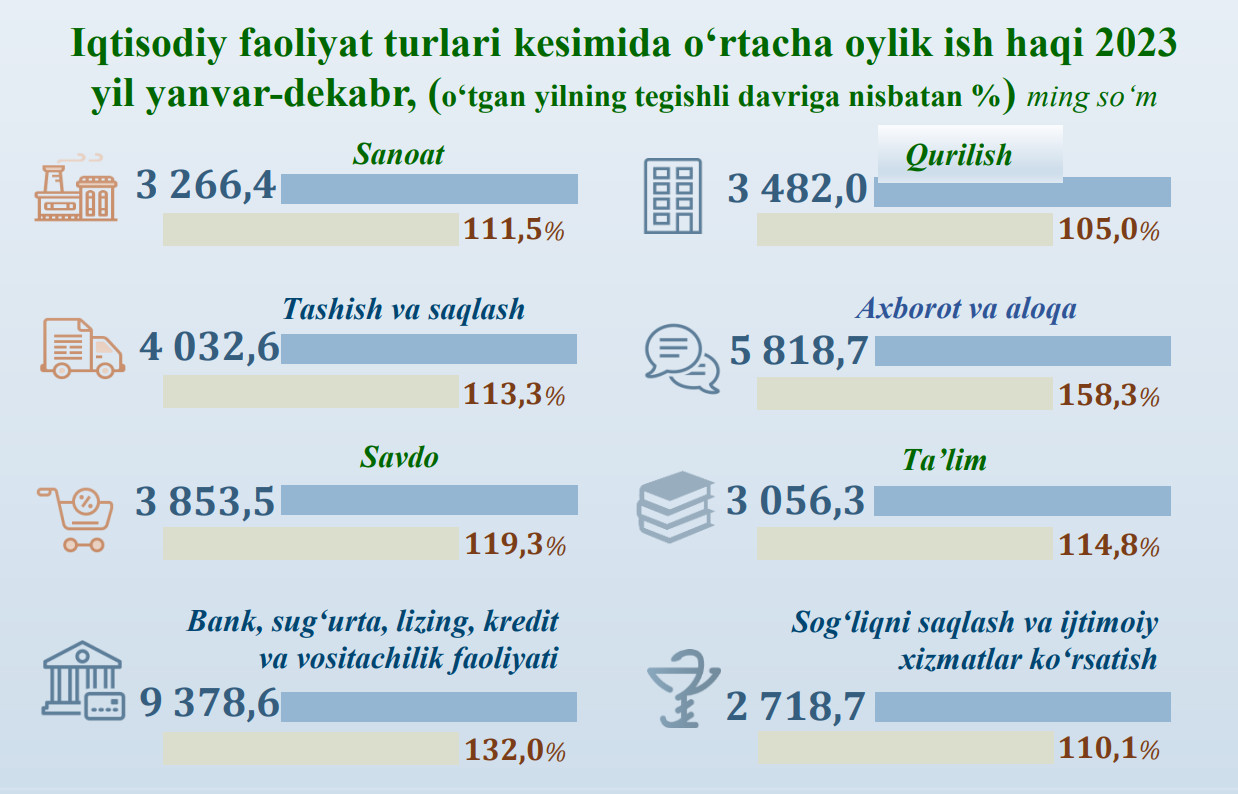 2023 - yil yanvar-dekabr oylarida iqtisodiy faoliyat turlari bo‘yicha o‘tgan yilning mos davriga nisbatan o‘sish darajasi eng baland ko‘rsatkichi – axborot va aloqa sohasiga to‘g‘ri kelib 158,3 % ni tashkil etdi.