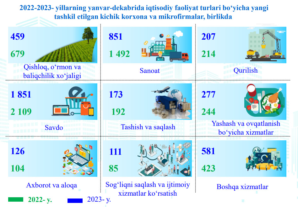 2022-2023- yillarning yanvar-dekabrida iqtisodiy faoliyat turlari boʻyicha yangi tashkil etilgan kichik korxona va mikrofirmalar, birlikda