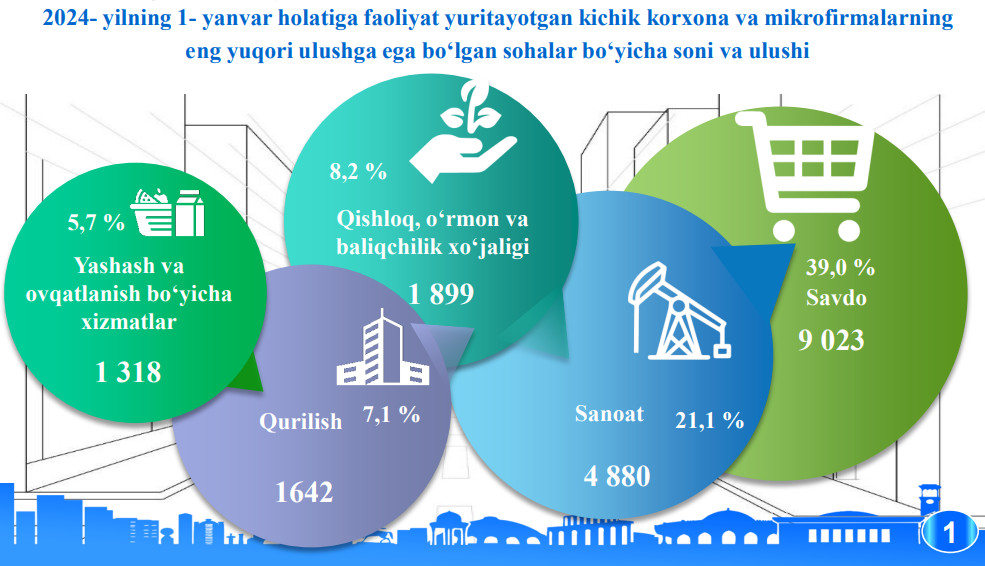 2024- yilning 1- yanvar holatiga viloyatimizda faoliyat yuritayotgan kichik korxona va mikrofirmalarning eng yuqori ulushga ega bo‘lgan sohalar bo‘yicha soni va ulushi