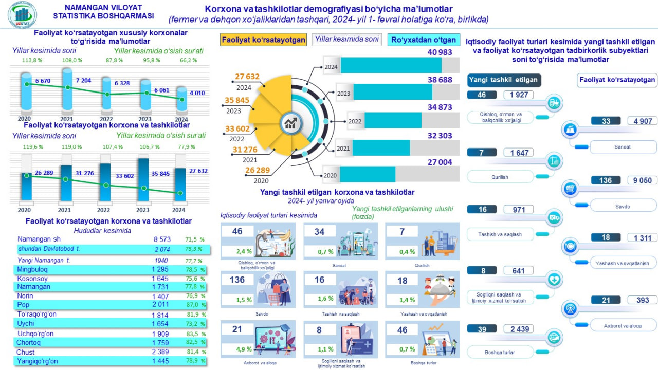 2024- yilning 1- fevral holatiga Namangan viloyatida ro'yxatdan o'tgan korxona va tashkilotlarlarning soni 40 983 tani tashkil etmoqda.