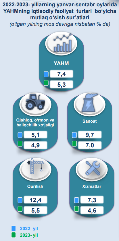 2023- yilning yanvar-sentabrida YAHM deflyatori indeksi 2022- yilning yanvar-sentabridagi narxlarga nisbatan 110,6 foizni tashkil etdi.