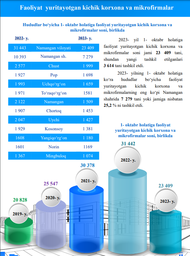 2023-yilning yanvar-oktabr oylarida 74 331 ta yangi kichik tadbirkorlik subyektlari tashkil etilgan (fermer va dehqon xo‘jaliklarisiz) bo‘lib, ularning so‘nggi yillarning mos davridagi dinamikasi quyidagicha: