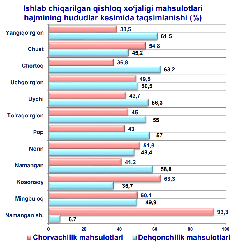 2023- yilning yanvar- sentabr oylarda Namangan viloyatida ishlab chiqarilgan qishloq xo‘jaligi mahsulotlari hajmining hududlar kesimida taqsimlanishi: