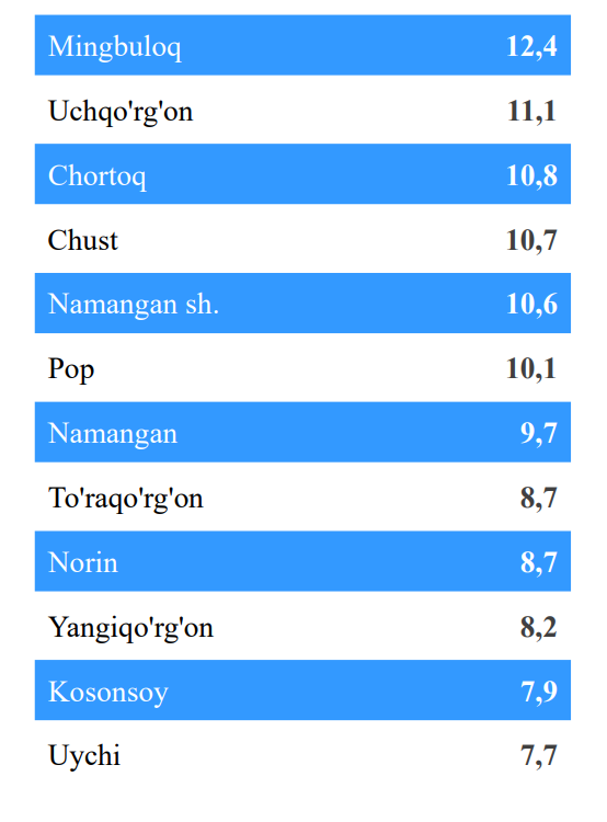 2023-yilning yanvar-sentabr oylarida FHDYO organlari tomonidan Namangan viloyati boʻyicha 1328 nafar egiz tugʻilganlar (ikki va undan koʻp chaqaloq) qayd etilgan.