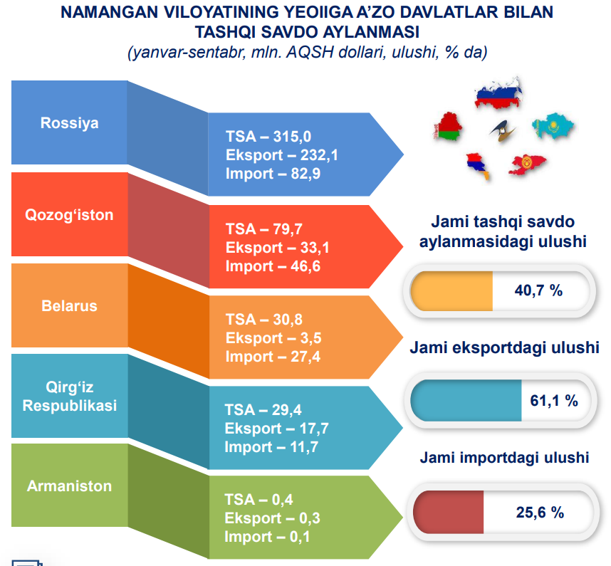 2023-yilning yanvar-sentabr oylarida Namangan viloyatining Yevroosiyo iqtisodiy ittifoqiga a’zo davlatlar bilan tashqi savdo aylanmasi 455,3 mln. AQSH dollarini tashkil etdi.