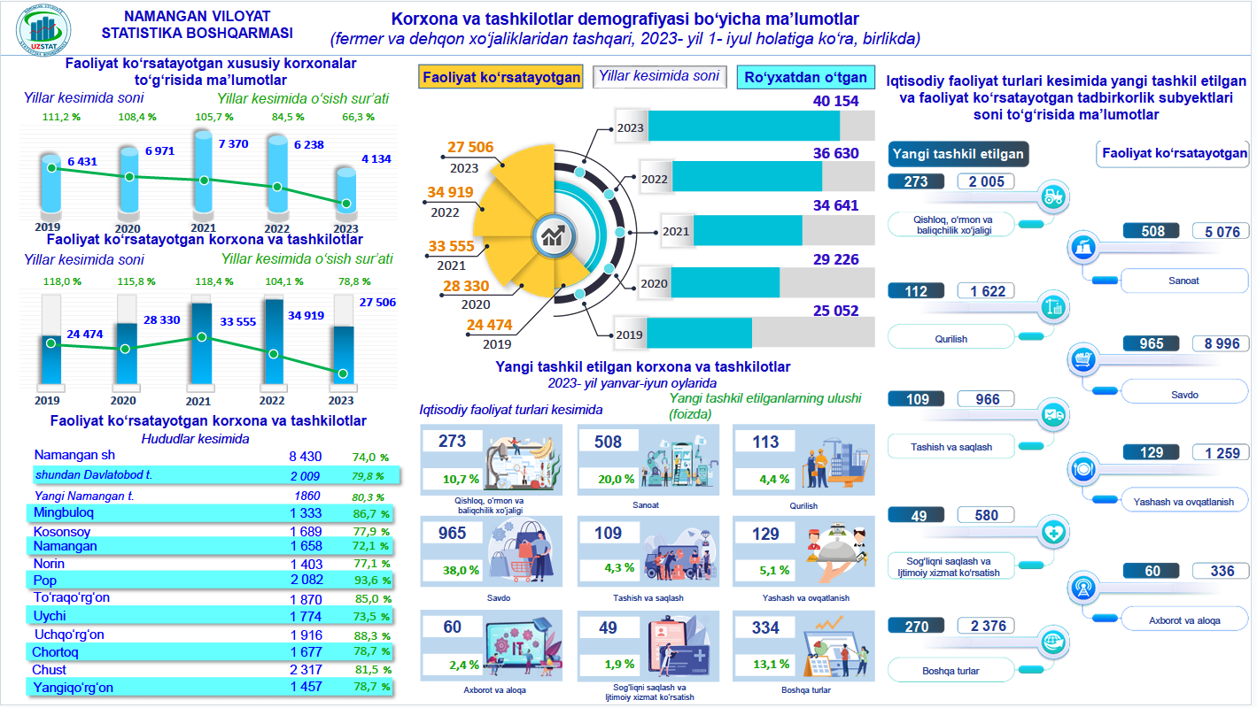 Namanganda 2023- yilning 1- iyul holatiga jami 997 ta oilaviy korxonalar faoliyat yuritayotganligi ma’lum bo‘ldi.