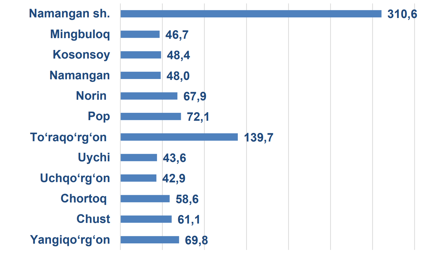 2023- yilning yanvar-may oylarida, Namangan viloyatida sog‘liqni saqlash sohasidagi xizmatlar hajmi 153,0 mlrd. so‘mgni tashkil etdi.