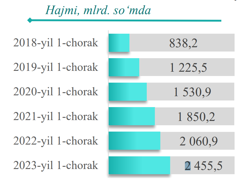 2023-yil 1-may holatiga jami ro‘yxatdan o‘tgan korxona va tashkilotlar soni 653 498 tani (fermer va dehqon xo‘jaliklarisiz) tashkil etib, ular o‘tgan yilning mos davriga nisbatan 69 700 taga oshib,