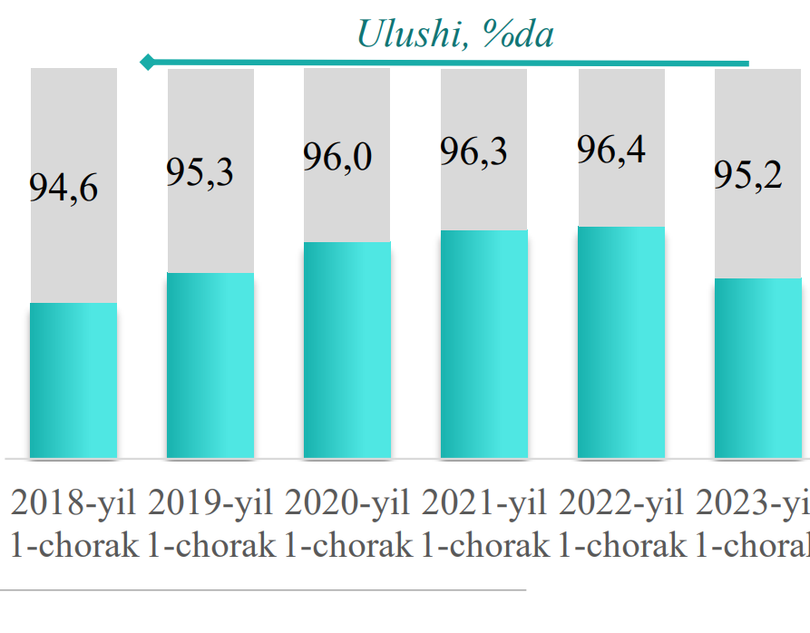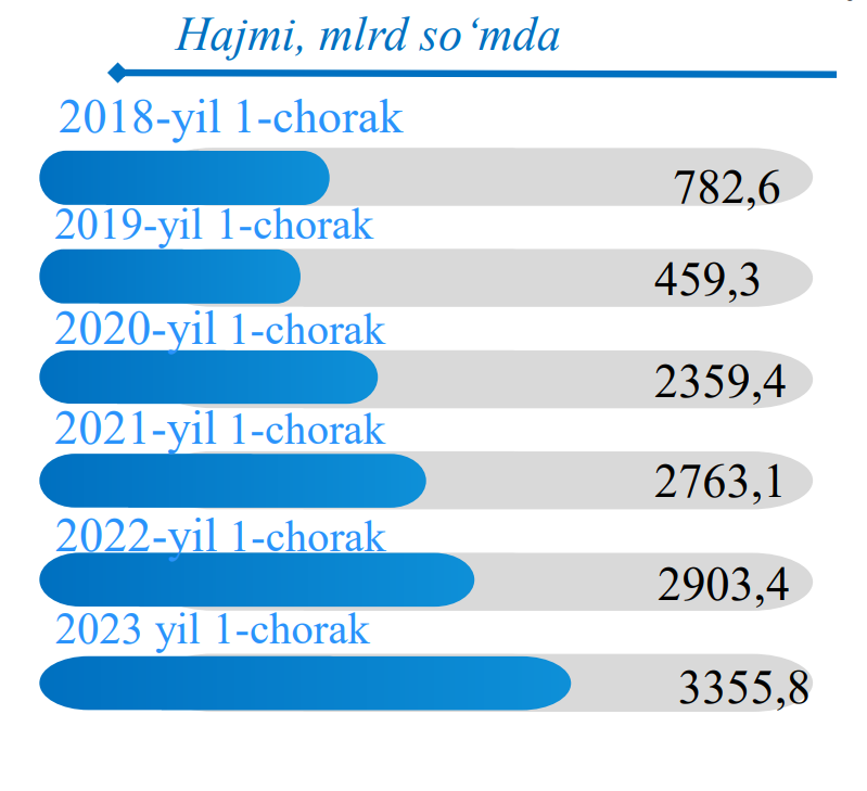 2023- yilning yanvar-aprel oylarida ta’lim sohasidagi xizmatlar hajmi 248,5 mlrd. so‘mga yetdi yoki bozor xizmatlari umumiy hajmining 4,3 % ini tashkil etdi.
