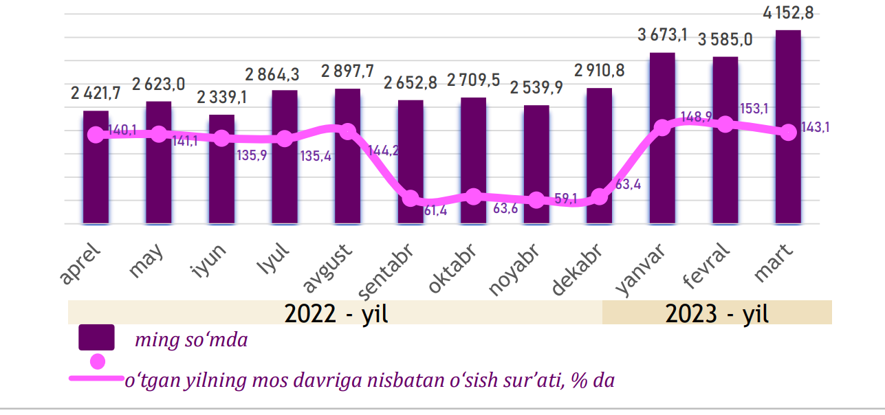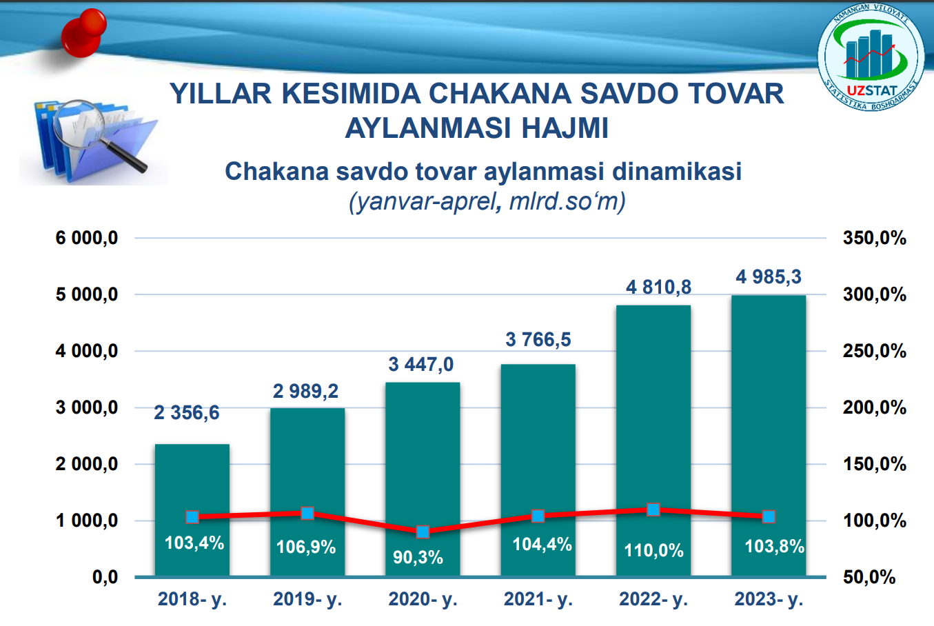 2023- yilning yanvar-aprel oylarida Namangan viloyatida chakana savdo tovar aylanmasi 4 985,3 mlrd. so‘mni tashkil qildi.